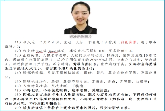 1.本人近三个月内正面、免冠、无妆、彩色电子证件照(白色单一背景,用于准考证照片、录取照片)。特别提醒:考生上传的证件照不得化妆,不得佩戴眼镜、隐形眼镜、美瞳拍摄,电子证件照图像应真实反映考生本人近期相貌,不得做任何修改(如不得使用PS等照片编辑软件处理),不得对人像特征(如伤疤、痣、发型等)进行技术处理,不得使用翻拍照片。具体照片要求如下图: