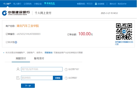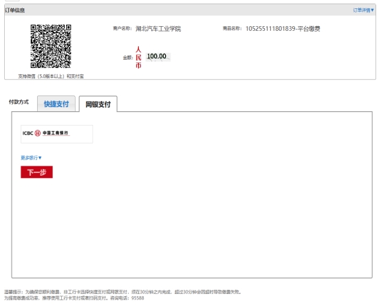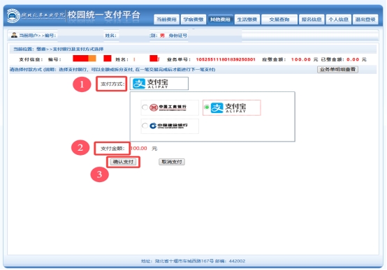 6.进入最终支付界面,具体界面因支付方式而异。如缴费失败,请先查询支付宝或银行是否已扣款,如已扣款系统会在1~2个工作日处理该订单,切勿重复交费。