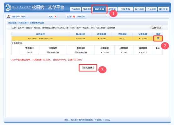 3.进入校园统一支付平台后,选择其他费用,勾选交费业务单信息,点击进入缴费。