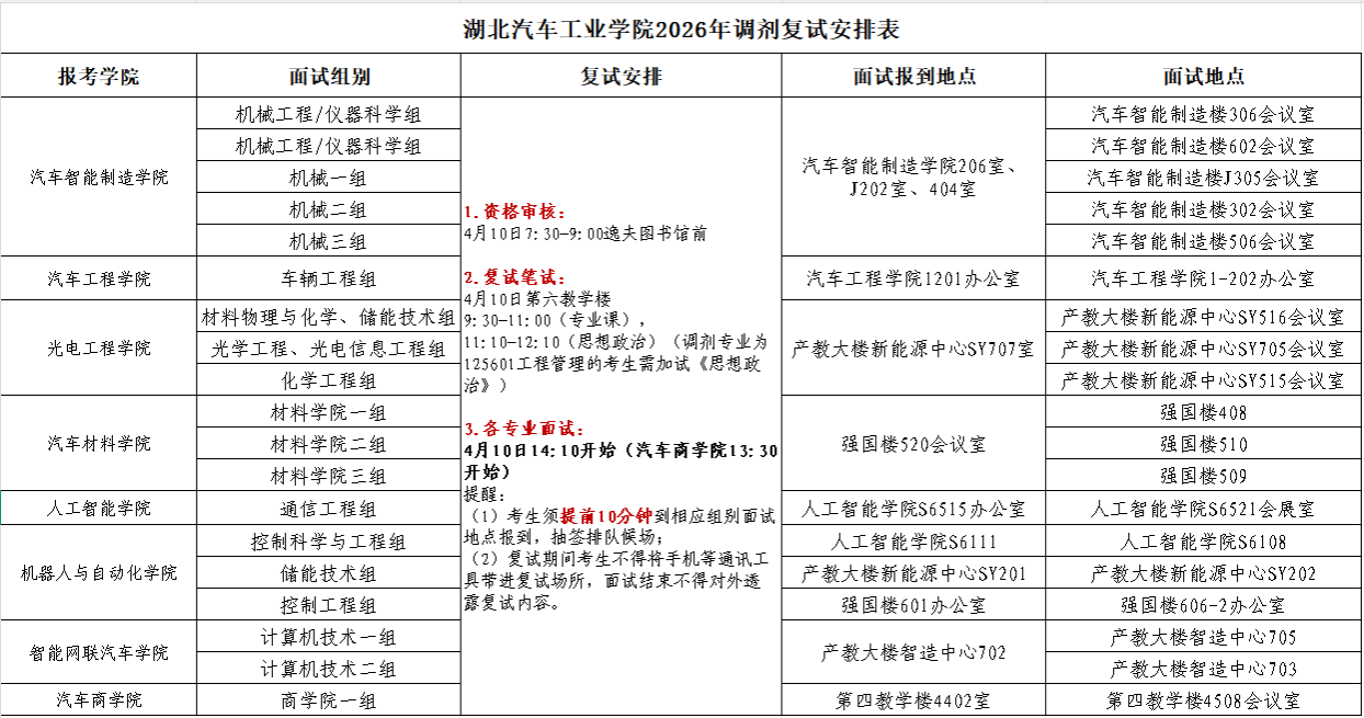研招通知 首页 >> 硕士招生 >> 研招通知 >> 正文 湖北汽车工业学院2026年硕士研究生调剂考生复试通知及安排(二) 发布时间:2026-04-09 点击量: 各位考生: 我校定于4月10日进行2026年硕士研究生调剂考生复试,现将有关事项通知如下: 一、复试具体安排 二、笔试相关要求 本次复试严格执行安检要求,考生进入考场不得携带手机、电子手表等物品,如有携带自行放入随身背包里,进入考场前放在教室门口,再进行安检。 为不影响正常教学秩序,请考生进出考场时不要大声喧哗。考试结束及时取走个人物品。 三、其他说明 复试期间校外考生可凭准考证进出校门。为了校园安全,不允许考生驾车进入校园,如驾车请停放在校外附近停车场。 考试结束后,在考场外有志愿者提供面试地点导引服务,有需求的考生请在考场门口咨询,志愿者将以学院为单位带领考生前往面试地点。 湖北汽车工业学院研究生院 2026年4月9日 上一条:湖北汽车工业学院2026年研究生复试调剂考生考场安排表 下一条:湖北汽车工业学院2026年研究生复试调剂考生考场安排表